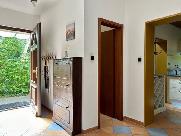 Der Wohnbereich beeindruckt durch seine Helligkeit, die dank der großen Fensterfront zur Westseite noch verstärkt wird. Vom Wohnzimmer aus haben Sie direkten Zugang zur Westterrasse und dem sonnigen Garten. Der Garten stellt eine idyllische Oase im Freien dar und ist mit einem großzügigen Schuppen ausgestattet, der ausreichend Platz für Gartenmöbel und -geräte bietet.