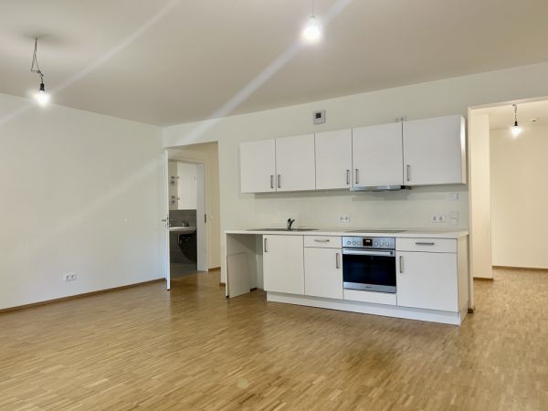 Die Wohnung verfügt über eine Einbauküche mit Spüle mit Abtropffläche, Herd mit Glas-Keramik-Kochfeld und Dunstabzugshaube mit Umluft. Eine integrierte Beleuchtung sorgt für ausreichend Licht.