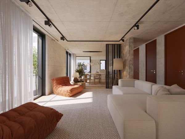 Der Wohnbereich besticht durch klare Linien, moderne Materialien und ausgewählte Gestaltungselemente. Sichtbetonflächen setzen architektonische Akzente und unterstreichen den zeitgemäßen Charakter der Immobilie. Die Innenausstattung ist hochwertig: Echtholzböden, bodentiefe Fenster und Sanitärobjekte von Markenherstellern wie Hans Grohe schaffen ein ebenso stilvolles wie funktionales Wohnambiente.